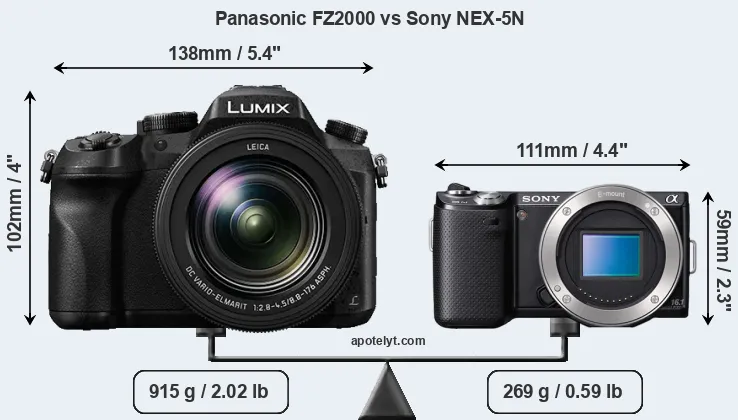 The physical size and weight of the Panasonic FZ2000 and the Sony NEX-5N are illustrated in the side-by-side display below. The two cameras are presented according to their relative size. Three consecutive perspectives from the front, the top, and the back are available. All width, height and depth dimensions are rounded to the nearest millimeter.