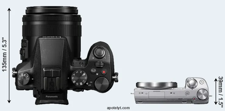 The physical size and weight of the Panasonic FZ2000 and the Sony NEX-5T are illustrated in the side-by-side display below. The two cameras are presented according to their relative size. Three consecutive perspectives from the front, the top, and the back are available. All width, height and depth dimensions are rounded to the nearest millimeter.
