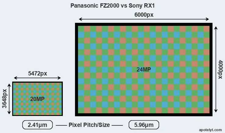 With 24MP, the RX1 offers a higher resolution than the FZ2000 (20MP), but the RX1 nevertheless has larger individual pixels (pixel pitch of 5.96μm versus 2.41μm for the FZ2000) due to its larger sensor. However, the FZ2000 is a much more recent model (by 4 years) than the RX1, and its sensor will have benefitted from technological advances during this time that enhance the light gathering capacity of its pixel-units.