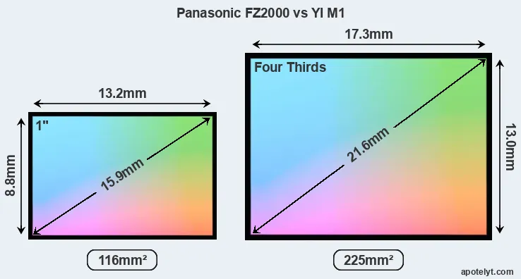 Of the two cameras under consideration, the Panasonic FZ2000 features an one-inch sensor and the YI M1 a Four Thirds sensor. The sensor area in the M1 is 94 percent bigger. As a result of these sensor size differences, the cameras have a format factor of, respectively, 2.7 and 2.0. The sensor in the FZ2000 has a native 3:2 aspect ratio, while the one in the M1 offers a 4:3 aspect.