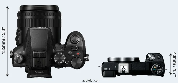 The physical size and weight of the Panasonic FZ2500 and the Sony NEX-6 are illustrated in the side-by-side display below. The two cameras are presented according to their relative size. Three consecutive perspectives from the front, the top, and the back are available. All width, height and depth dimensions are rounded to the nearest millimeter.