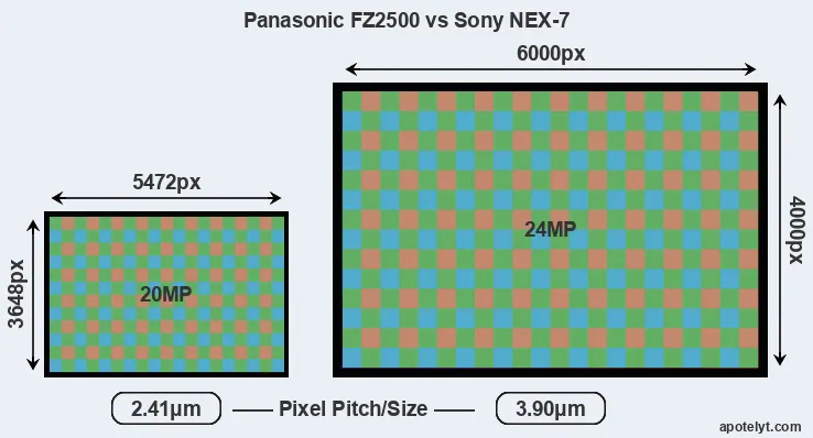 With 24MP, the NEX-7 offers a higher resolution than the FZ2500 (20MP), but the NEX-7 nevertheless has larger individual pixels (pixel pitch of 3.90μm versus 2.41μm for the FZ2500) due to its larger sensor. However, the FZ2500 is a much more recent model (by 5 years) than the NEX-7, and its sensor will have benefitted from technological advances during this time that enhance the light gathering capacity of its pixel-units.