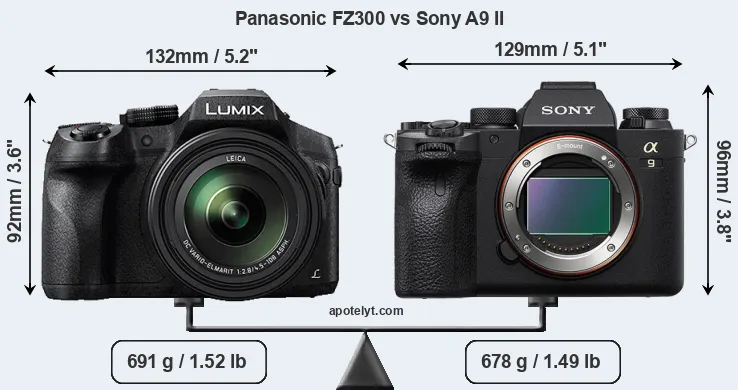 An illustration of the physical size and weight of the Panasonic FZ300 and the Sony A9 II is provided in the side-by-side display below. The two cameras are presented according to their relative size. Three successive views from the front, the top, and the rear are shown. All width, height and depth dimensions are rounded to the nearest millimeter.