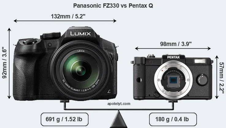 An illustration of the physical size and weight of the Panasonic FZ330 and the Pentax Q is provided in the side-by-side display below. The two cameras are presented according to their relative size. Three consecutive perspectives from the front, the top, and the back are available. All width, height and depth dimensions are rounded to the nearest millimeter.