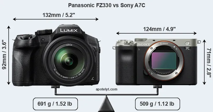 The above size and weight comparisons are to some extent incomplete and possibly misleading, as the FZ330 has a lens built in, whereas the A7C is an interchangeable lens camera that requires a separate lens. Attaching the latter will add extra weight and bulk to the setup. You can compare the optics available for the A7C and their specifications in the Sony FE Lens Catalog.