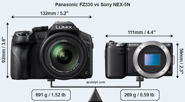 The side-by-side display below illustrates the physical size and weight of the Panasonic FZ330 and the Sony NEX-5N. The two cameras are presented according to their relative size. Three consecutive perspectives from the front, the top, and the back are available. All width, height and depth measures are rounded to the nearest millimeter.