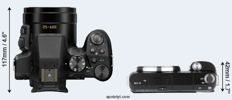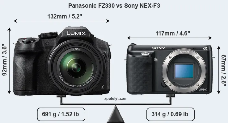 An illustration of the physical size and weight of the Panasonic FZ330 and the Sony NEX-F3 is provided in the side-by-side display below. The two cameras are presented according to their relative size. Three consecutive perspectives from the front, the top, and the back are available. All width, height and depth dimensions are rounded to the nearest millimeter.