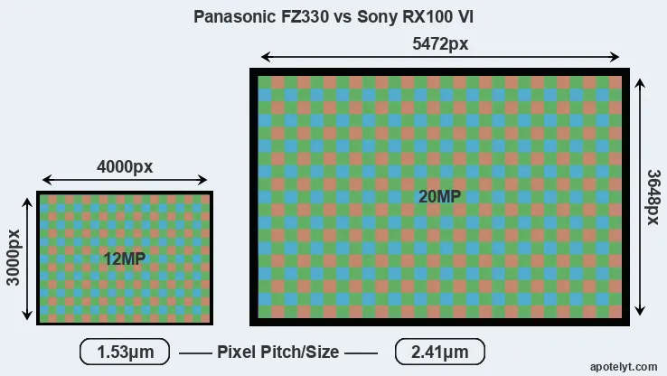 | Sensor Specs | Panasonic FZ330 | Sony RX100 VI |