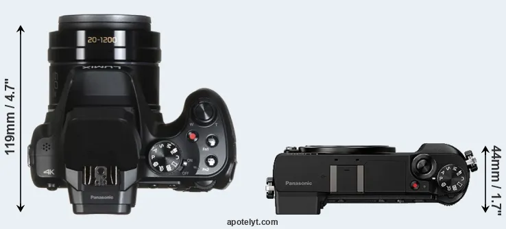 An illustration of the physical size and weight of the Panasonic FZ82 and the Panasonic GX80 is provided in the side-by-side display below. The two cameras are presented according to their relative size. Three consecutive views from the front, the top, and the rear side are shown. All width, height and depth measures are rounded to the nearest millimeter.