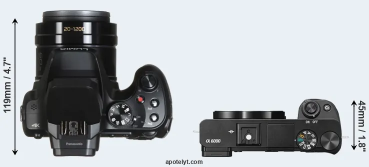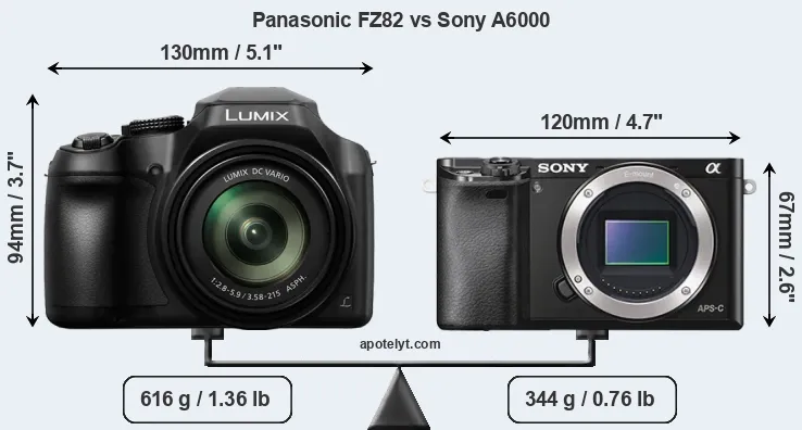 The side-by-side display below illustrates the physical size and weight of the Panasonic FZ82 and the Sony A6000. The two cameras are presented according to their relative size. Three consecutive perspectives from the front, the top, and the back are available. All width, height and depth dimensions are rounded to the nearest millimeter.