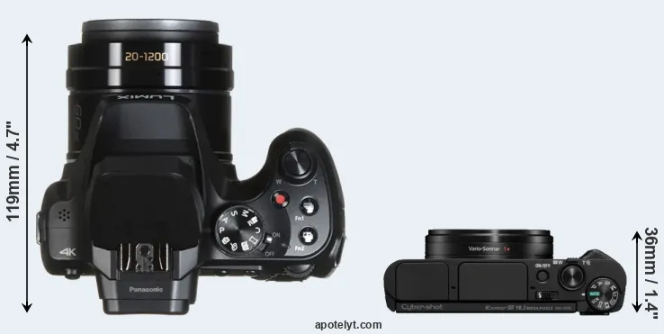 The side-by-side display below illustrates the physical size and weight of the Panasonic FZ82 and the Sony HX95. The two cameras are presented according to their relative size. Three consecutive perspectives from the front, the top, and the back are available. All size dimensions are rounded to the nearest millimeter.