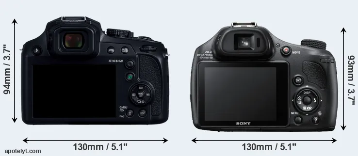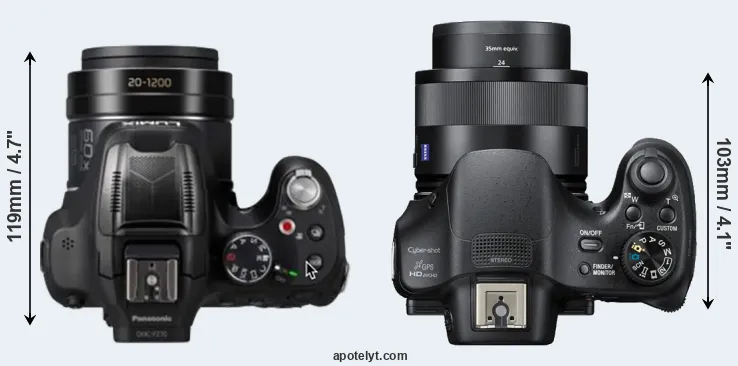 The side-by-side display below illustrates the physical size and weight of the Panasonic FZ82D and the Sony HX400V. The two cameras are presented according to their relative size. Three consecutive perspectives from the front, the top, and the back are available. All width, height and depth measures are rounded to the nearest millimeter.