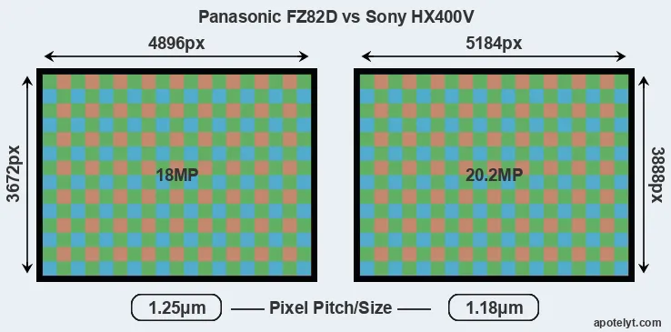 While the two cameras under review share the same sensor size, the HX400V offers a higher resolution of 20.2 megapixels, compared with 18 MP of the FZ82D. This megapixels advantage translates into a 6 percent gain in linear resolution. On the other hand, these sensor specs imply that the HX400V has a higher pixel density and a smaller size of the individual pixel (with a pixel pitch of 1.18μm versus 1.25μm for the FZ82D). Moreover, it should be noted, that the FZ82D is much more recent (by 10 years and 4 months) than the HX400V, and its sensor will have benefitted from technological advances during this time that further enhance the light gathering capacity of individual pixels. Coming back to sensor resolution, it should be mentioned that neither of the two cameras has an anti-alias filter installed, so they are able to capture all the detail the sensor resolves.