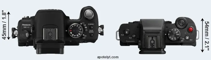 The physical size and weight of the Panasonic G1 and the Panasonic G100 are illustrated in the side-by-side display below. The two cameras are presented according to their relative size. Three consecutive views from the front, the top, and the rear side are shown. All size dimensions are rounded to the nearest millimeter.
