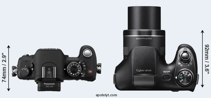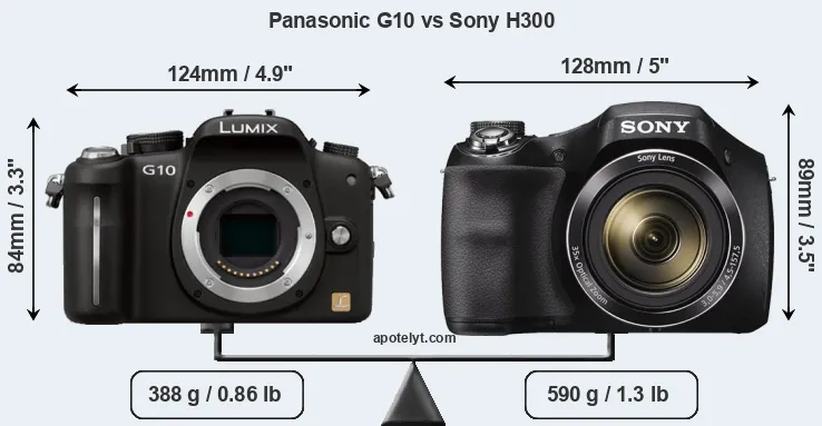The side-by-side display below illustrates the physical size and weight of the Panasonic G10 and the Sony H300. The two cameras are presented according to their relative size. Three consecutive views from the front, the top, and the rear side are shown. All width, height and depth dimensions are rounded to the nearest millimeter.