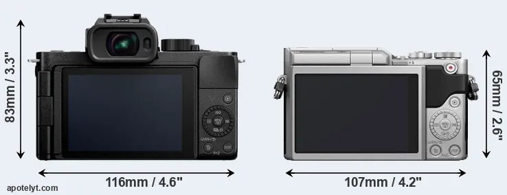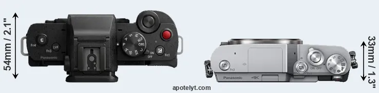 The side-by-side display below illustrates the physical size and weight of the Panasonic G100 and the Panasonic GX850. The two cameras are presented according to their relative size. Three successive views from the front, the top, and the rear are shown. All width, height and depth measures are rounded to the nearest millimeter.