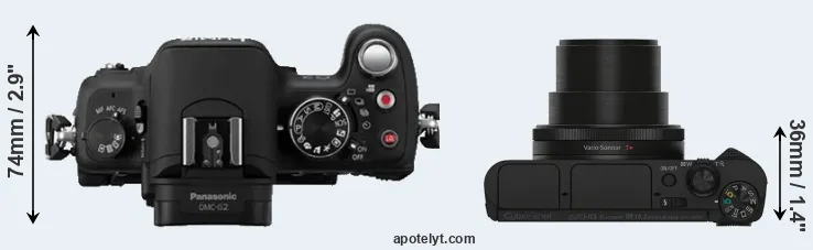 The physical size and weight of the Panasonic G2 and the Sony HX90V are illustrated in the side-by-side display below. The two cameras are presented according to their relative size. Three consecutive views from the front, the top, and the rear side are shown. All size dimensions are rounded to the nearest millimeter.