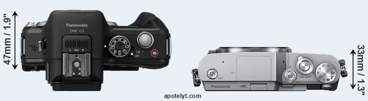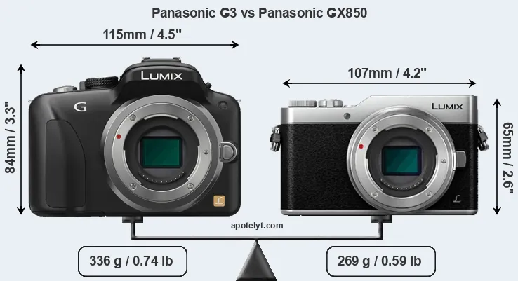 An illustration of the physical size and weight of the Panasonic G3 and the Panasonic GX850 is provided in the side-by-side display below. The two cameras are presented according to their relative size. Three consecutive perspectives from the front, the top, and the back are available. All width, height and depth dimensions are rounded to the nearest millimeter.