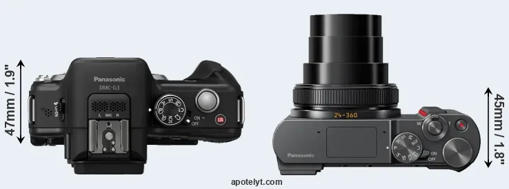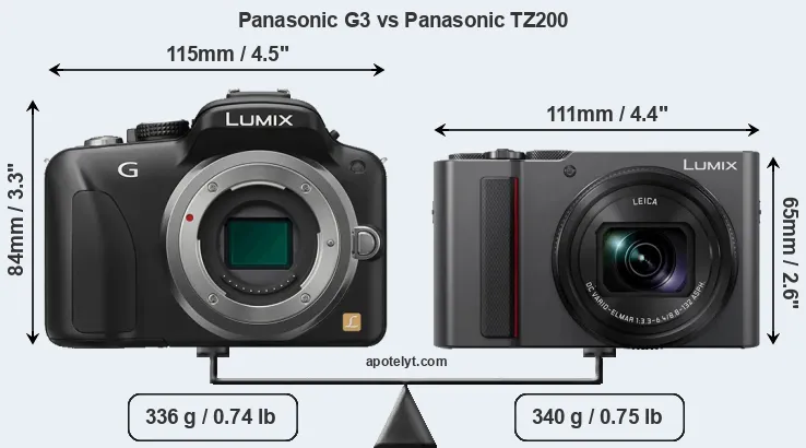 The side-by-side display below illustrates the physical size and weight of the Panasonic G3 and the Panasonic TZ200. The two cameras are presented according to their relative size. Three consecutive perspectives from the front, the top, and the back are available. All size dimensions are rounded to the nearest millimeter.