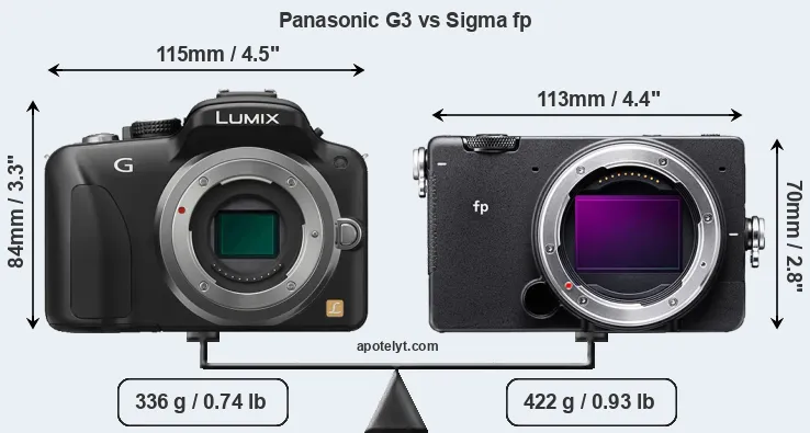 If the front view area (width x height) of the cameras is taken as an aggregate measure of their size, the Sigma fp is notably smaller (18 percent) than the Panasonic G3. However, the fp is markedly heavier (26 percent) than the G3. It is noteworthy in this context that the fp is splash and dust-proof, while the G3 does not feature any corresponding weather-sealing.