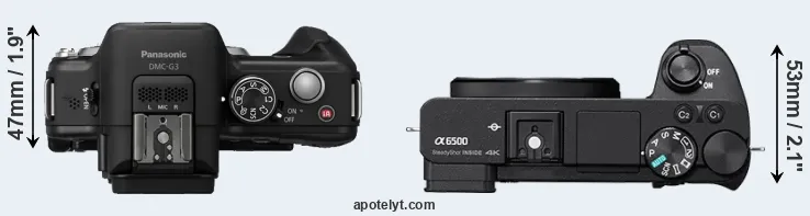 An illustration of the physical size and weight of the Panasonic G3 and the Sony A6500 is provided in the side-by-side display below. The two cameras are presented according to their relative size. Three consecutive perspectives from the front, the top, and the back are available. All width, height and depth dimensions are rounded to the nearest millimeter.