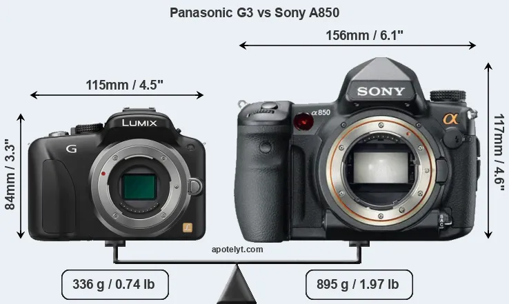 If the front view area (width x height) of the cameras is taken as an aggregate measure of their size, the Sony A850 is considerably larger (89 percent) than the Panasonic G3. Moreover, the A850 is substantially heavier (166 percent) than the G3. It is noteworthy in this context that the A850 is splash and dust-proof, while the G3 does not feature any corresponding weather-sealing.
