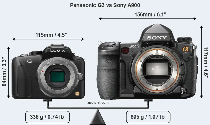 If the front view area (width x height) of the cameras is taken as an aggregate measure of their size, the Sony A900 is considerably larger (89 percent) than the Panasonic G3. Moreover, the A900 is substantially heavier (166 percent) than the G3. It is noteworthy in this context that the A900 is splash and dust-proof, while the G3 does not feature any corresponding weather-sealing.