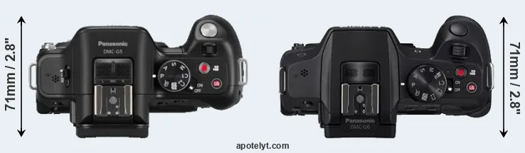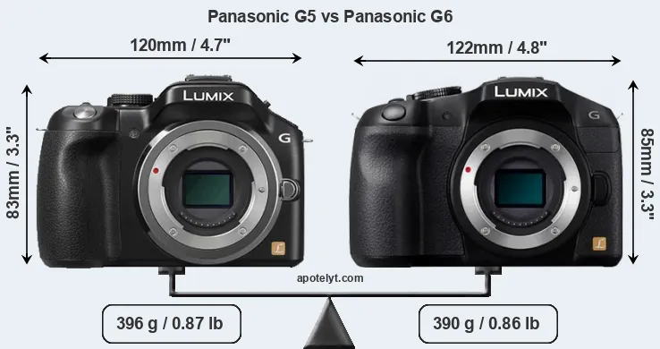 If the front view area (width x height) of the cameras is taken as an aggregate measure of their size, the Panasonic G6 is somewhat larger (4 percent) than the Panasonic G5. However, the G6 is slightly lighter (2 percent) than the G5. In this context, it is worth noting that neither the G5 nor the G6 are weather-sealed.