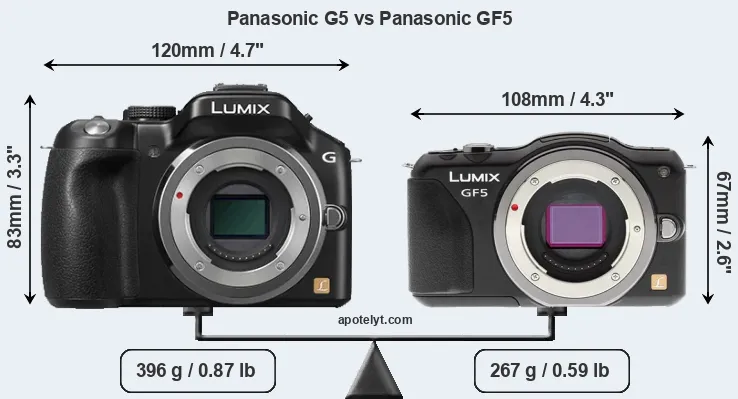 An illustration of the physical size and weight of the Panasonic G5 and the Panasonic GF5 is provided in the side-by-side display below. The two cameras are presented according to their relative size. Three consecutive perspectives from the front, the top, and the back are available. All width, height and depth dimensions are rounded to the nearest millimeter.