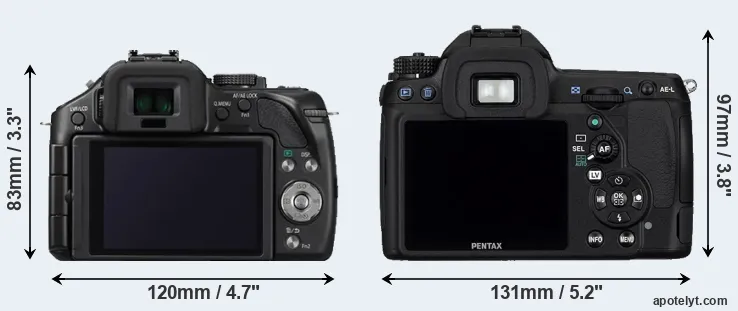 If the front view area (width x height) of the cameras is taken as an aggregate measure of their size, the Pentax K-5 is notably larger (28 percent) than the Panasonic G5. Moreover, the K-5 is substantially heavier (92 percent) than the G5. It is noteworthy in this context that the K-5 is splash and dust-proof, while the G5 does not feature any corresponding weather-sealing.