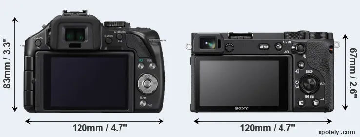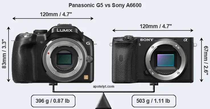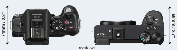 The side-by-side display below illustrates the physical size and weight of the Panasonic G5 and the Sony A6600. The two cameras are presented according to their relative size. Three consecutive perspectives from the front, the top, and the back are available. All width, height and depth measures are rounded to the nearest millimeter.