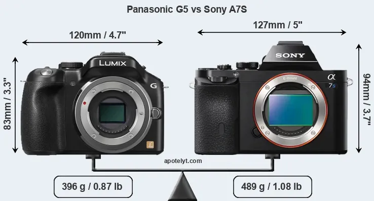 If the front view area (width x height) of the cameras is taken as an aggregate measure of their size, the Sony A7S is notably larger (20 percent) than the Panasonic G5. Moreover, the A7S is markedly heavier (23 percent) than the G5. It is noteworthy in this context that the A7S is splash and dust-proof, while the G5 does not feature any corresponding weather-sealing.