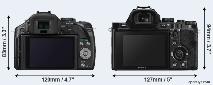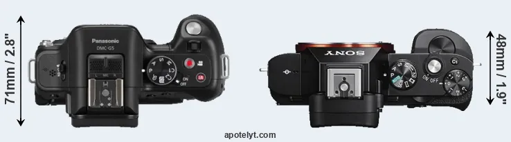 The physical size and weight of the Panasonic G5 and the Sony A7S are illustrated in the side-by-side display below. The two cameras are presented according to their relative size. Three consecutive perspectives from the front, the top, and the back are available. All width, height and depth measures are rounded to the nearest millimeter.