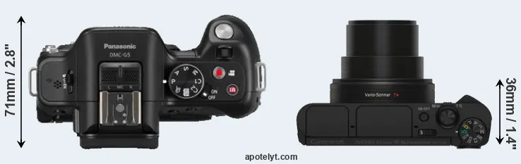 The physical size and weight of the Panasonic G5 and the Sony HX80 are illustrated in the side-by-side display below. The two cameras are presented according to their relative size. Three consecutive views from the front, the top, and the rear side are shown. All width, height and depth measures are rounded to the nearest millimeter.