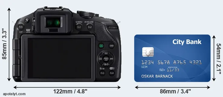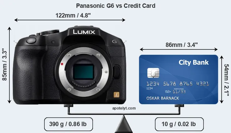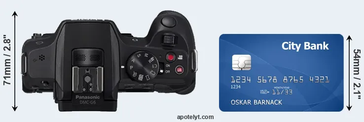 An illustration of the physical dimensions of the Panasonic G6 vis-à-vis a credit card is provided in the side-by-side display below. Three consecutive perspectives from the front, the top, and the back are presented. All width, height and depth measures are rounded to the nearest millimeter.