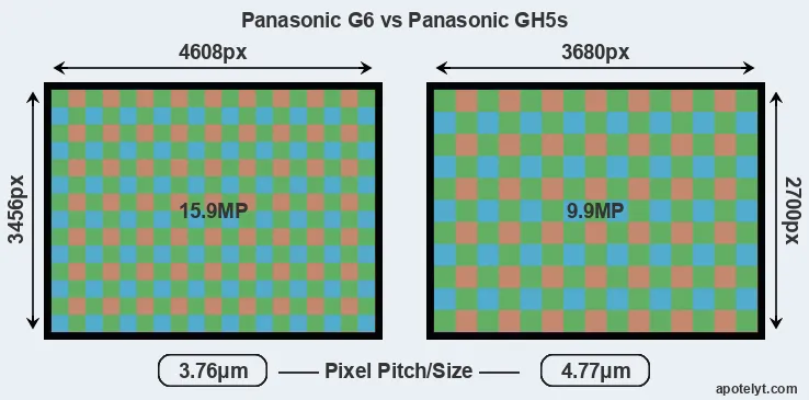 While the two cameras under review share the same sensor size, the G6 offers a higher resolution of 15.9 megapixels, compared with 9.9 MP of the GH5s. This megapixels advantage translates into a 25 percent gain in linear resolution. On the other hand, these sensor specs imply that the G6 has a higher pixel density and a smaller size of the individual pixel (with a pixel pitch of 3.76μm versus 4.77μm for the GH5s). Moreover, it should be noted that the GH5s is much more recent (by 4 years and 8 months) than the G6, and its sensor will have benefitted from technological advances during this time that further enhance the light gathering capacity of individual pixels. Coming back to sensor resolution, it should be mentioned that the GH5s has no anti-alias filter installed, so that it can capture all the detail its sensor resolves.