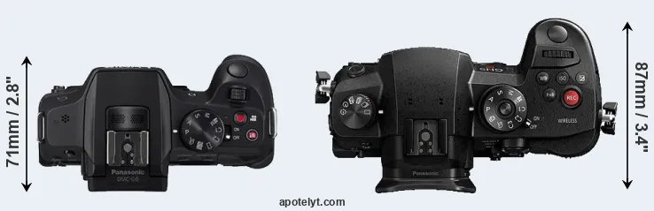 The side-by-side display below illustrates the physical size and weight of the Panasonic G6 and the Panasonic GH5s. The two cameras are presented according to their relative size. Three successive views from the front, the top, and the rear are shown. All width, height and depth dimensions are rounded to the nearest millimeter.