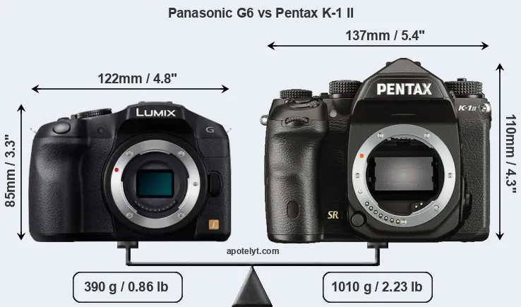 If the front view area (width x height) of the cameras is taken as an aggregate measure of their size, the Pentax K-1 II is considerably larger (45 percent) than the Panasonic G6. Moreover, the K-1 II is substantially heavier (159 percent) than the G6. It is noteworthy in this context that the K-1 II is splash and dust-proof, while the G6 does not feature any corresponding weather-sealing.