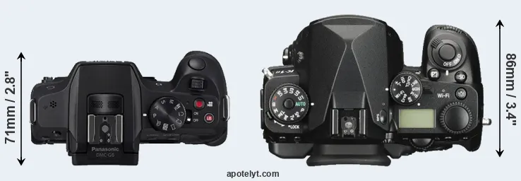 The physical size and weight of the Panasonic G6 and the Pentax K-1 II are illustrated in the side-by-side display below. The two cameras are presented according to their relative size. Three consecutive views from the front, the top, and the rear side are shown. All width, height and depth measures are rounded to the nearest millimeter.