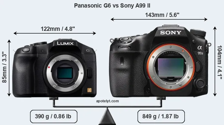 If the front view area (width x height) of the cameras is taken as an aggregate measure of their size, the Sony A99 II is considerably larger (43 percent) than the Panasonic G6. Moreover, the A99 II is substantially heavier (118 percent) than the G6. It is noteworthy in this context that the A99 II is splash and dust-proof, while the G6 does not feature any corresponding weather-sealing.
