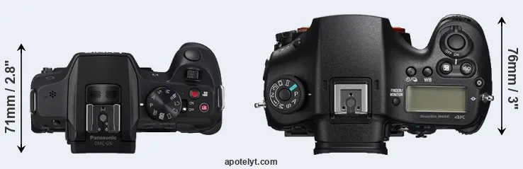 The side-by-side display below illustrates the physical size and weight of the Panasonic G6 and the Sony A99 II. The two cameras are presented according to their relative size. Three consecutive views from the front, the top, and the rear side are shown. All size dimensions are rounded to the nearest millimeter.
