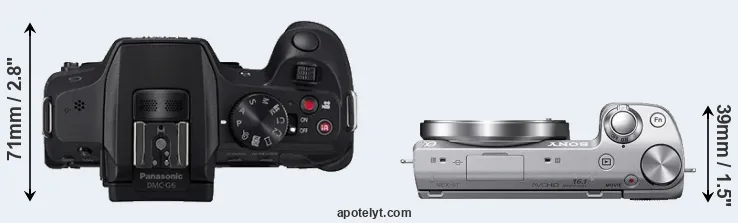 An illustration of the physical size and weight of the Panasonic G6 and the Sony NEX-5T is provided in the side-by-side display below. The two cameras are presented according to their relative size. Three successive views from the front, the top, and the rear are shown. All size dimensions are rounded to the nearest millimeter.