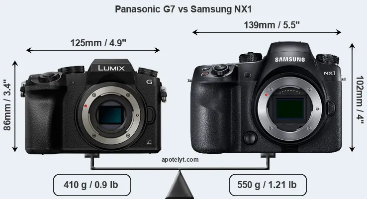 If the front view area (width x height) of the cameras is taken as an aggregate measure of their size, the Samsung NX1 is notably larger (32 percent) than the Panasonic G7. Moreover, the NX1 is markedly heavier (34 percent) than the G7. It is noteworthy in this context that the NX1 is splash and dust-proof, while the G7 does not feature any corresponding weather-sealing.
