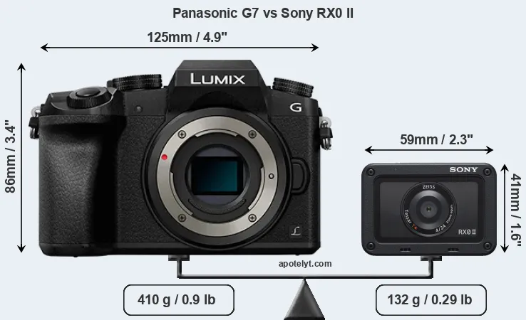 If the front view area (width x height) of the cameras is taken as an aggregate measure of their size, the Sony RX0 II is considerably smaller (77 percent) than the Panasonic G7. It is noteworthy in this context that the RX0 II is splash and dust-proof, while the G7 does not feature any corresponding weather-sealing. More than that, the RX0 II is water-proof up to 10m and can, thus, be used for underwater photography.