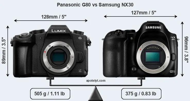 If the front view area (width x height) of the cameras is taken as an aggregate measure of their size, the Samsung NX30 is notably larger (7 percent) than the Panasonic G80. However, the NX30 is markedly lighter (26 percent) than the G80. It is worth mentioning in this context that the G80 is splash and dust resistant, while the NX30 does not feature any corresponding weather-sealing.