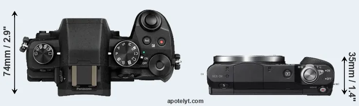The side-by-side display below illustrates the physical size and weight of the Panasonic G80 and the Sony NEX-3N. The two cameras are presented according to their relative size. Three successive views from the front, the top, and the rear are shown. All size dimensions are rounded to the nearest millimeter.