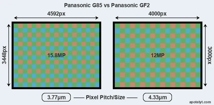 While the two cameras under review share the same sensor size, the G85 offers a higher resolution of 15.8 megapixels, compared with 12 MP of the GF2. This megapixels advantage translates into a 15 percent gain in linear resolution. On the other hand, these sensor specs imply that the G85 has a higher pixel density and a smaller size of the individual pixel (with a pixel pitch of 3.77μm versus 4.33μm for the GF2). In this context, it should be noted, however, that the G85 is much more recent (by 5 years and 10 months) than the GF2, and its sensor will have benefitted from technological advances during this time that compensate for the smaller pixel size. Coming back to sensor resolution, it should be mentioned that the G85 has no anti-alias filter installed, so that it can capture all the detail its sensor resolves.
