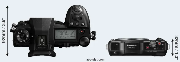 The side-by-side display below illustrates the physical size and weight of the Panasonic G9 and the Panasonic GF3. The two cameras are presented according to their relative size. Three successive views from the front, the top, and the rear are shown. All size dimensions are rounded to the nearest millimeter.