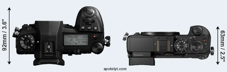 The physical size and weight of the Panasonic G9 and the Panasonic GX8 are illustrated in the side-by-side display below. The two cameras are presented according to their relative size. Three successive views from the front, the top, and the rear are shown. All width, height and depth dimensions are rounded to the nearest millimeter.