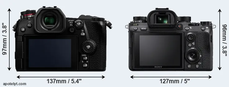The side-by-side display below illustrates the physical size and weight of the Panasonic G9 and the Sony A9. The two cameras are presented according to their relative size. Three consecutive perspectives from the front, the top, and the back are available. All width, height and depth measures are rounded to the nearest millimeter.